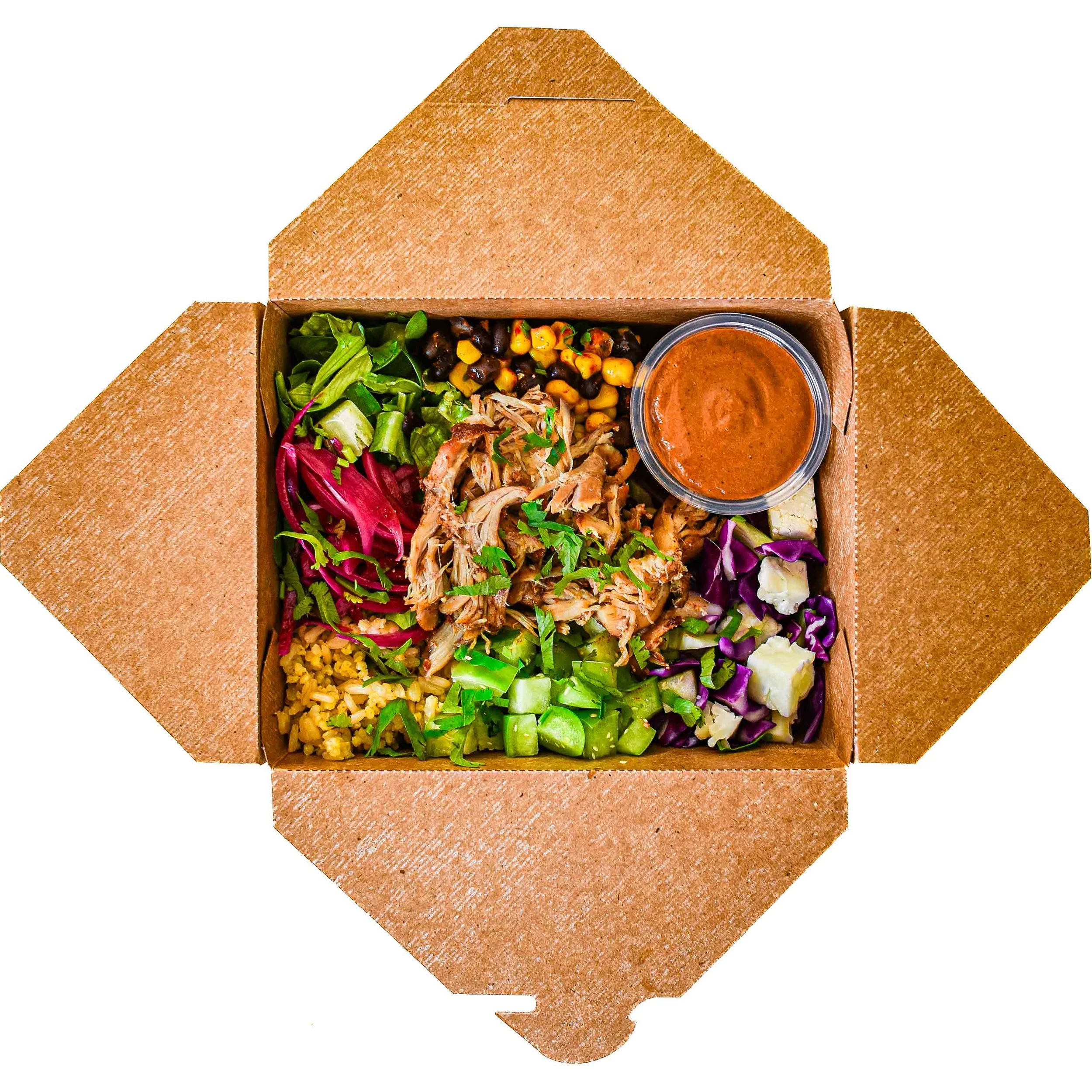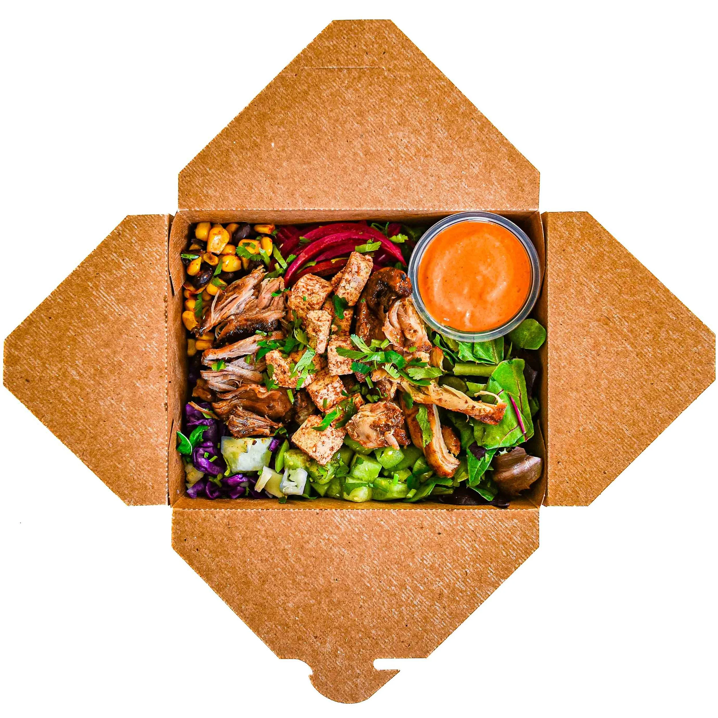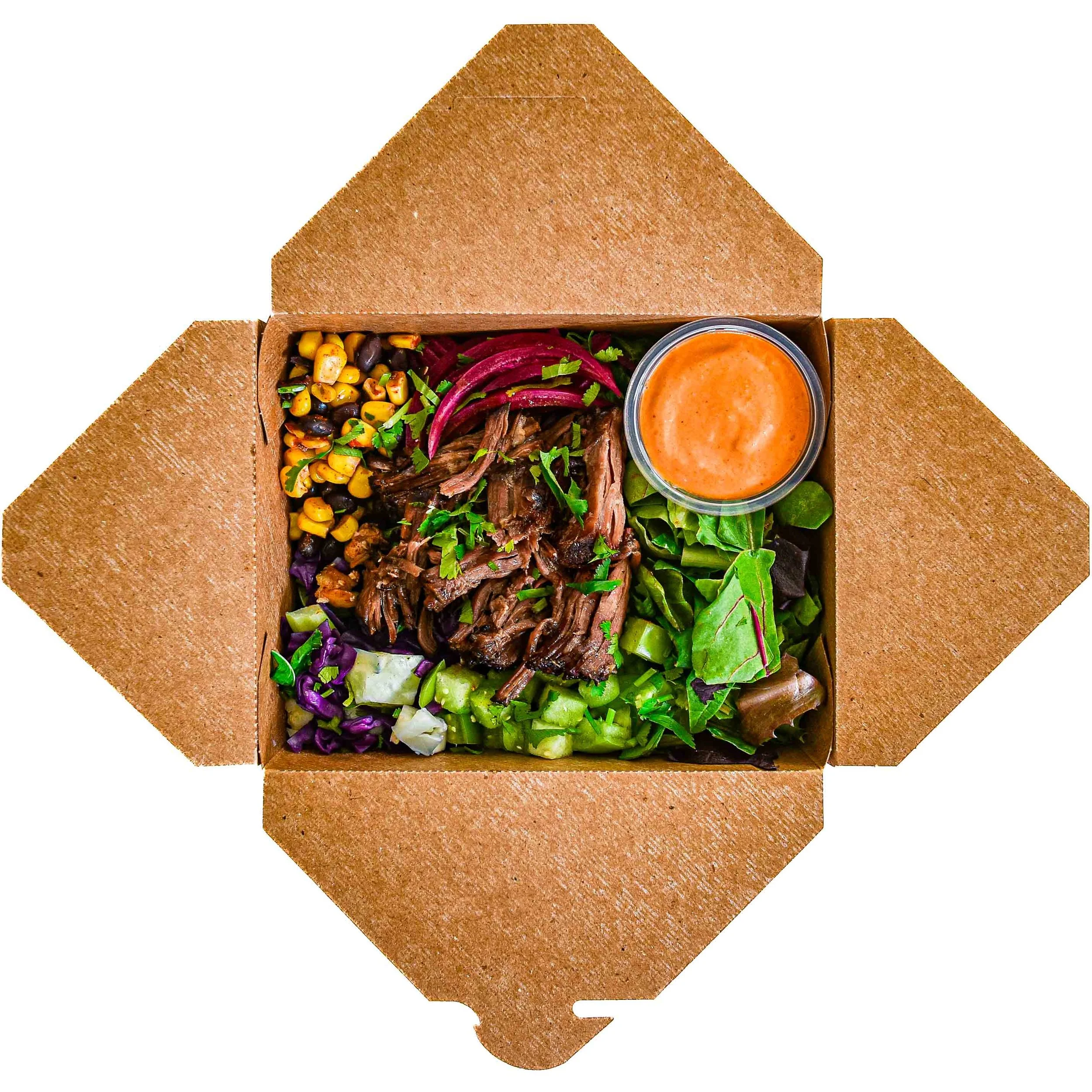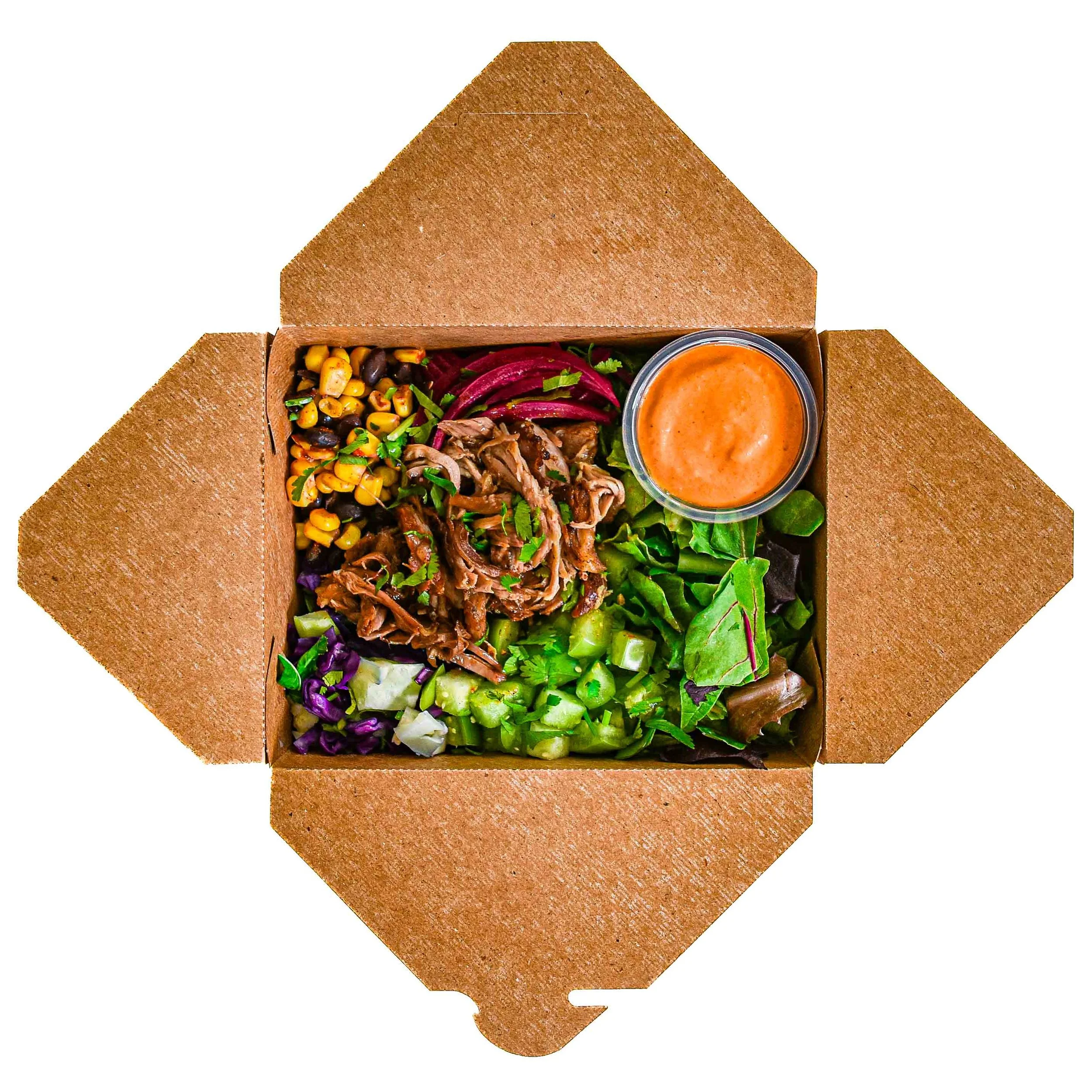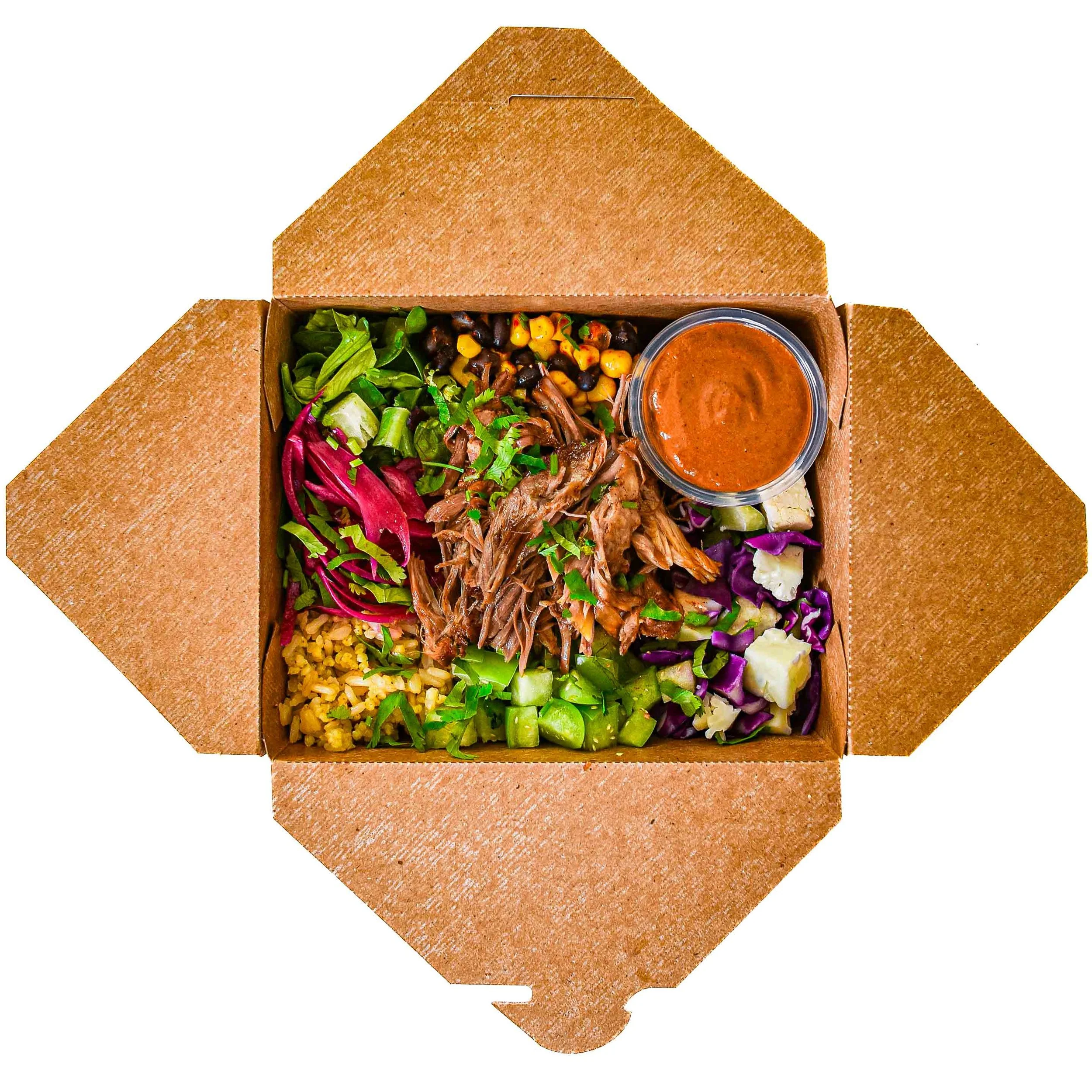 ensalada greens, slow cooked wagyu beef barbacoa, cauliflower & red cabbage, taco seasoned corn and black beans, fresh tomatillos, pickled onion, cilantro garnish, & choice of palmita house sauces // gluten, dairy, soy, & refined sugar free