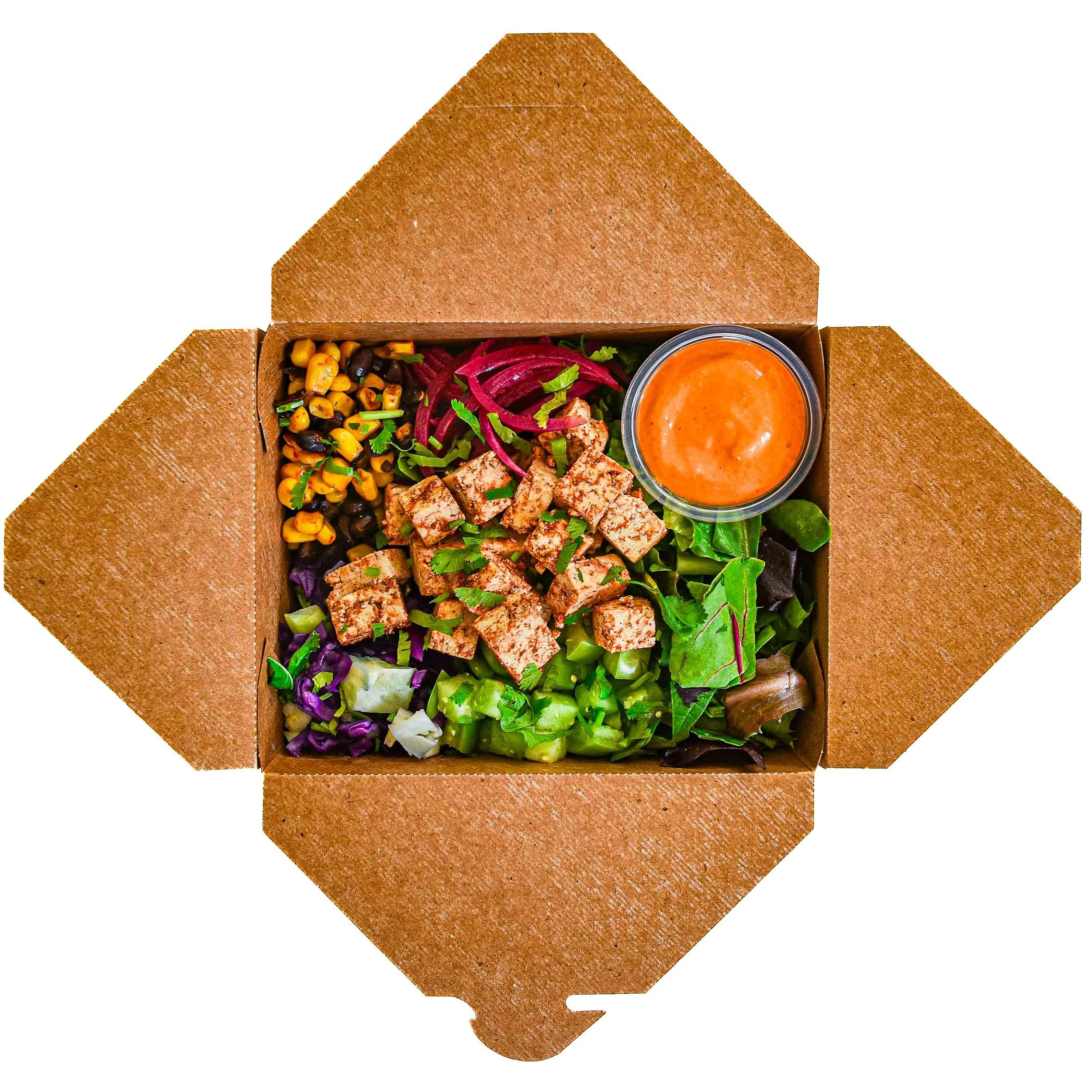 ensalada greens, organic tofu, cauliflower & red cabbage, taco seasoned corn and black beans, fresh tomatillos, pickled onion, cilantro garnish, & choice of palmita house sauces // gluten, dairy, & refined sugar free // 100% plant based