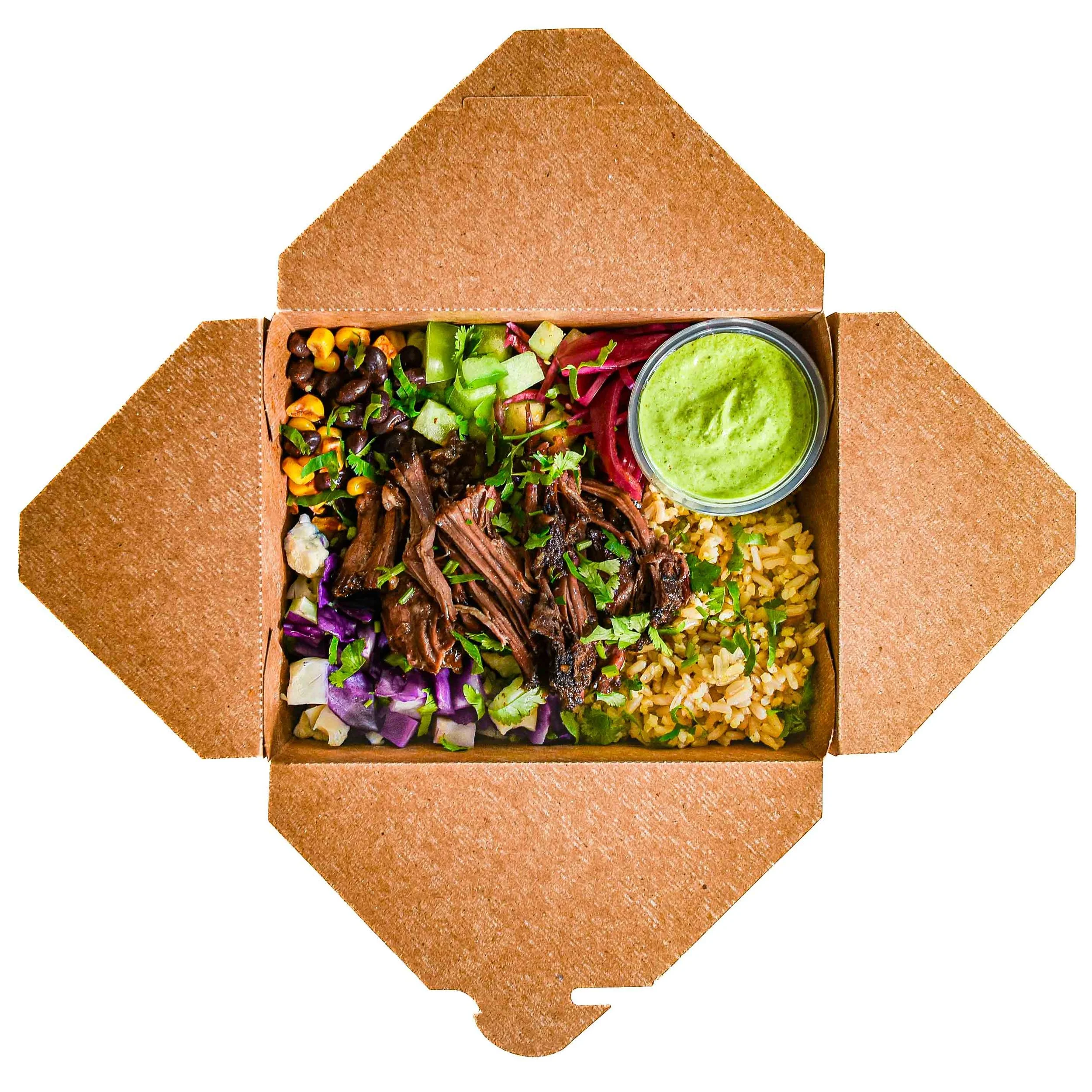 garlic rice & millet + ensalada greens, slow cooked wagyu beef barbacoa, cauliflower & red cabbage, taco seasoned corn and black beans, fresh tomatillos, pickled onion, cilantro garnish, & choice of palmita house sauces // gluten, dairy, soy, & refined sugar free